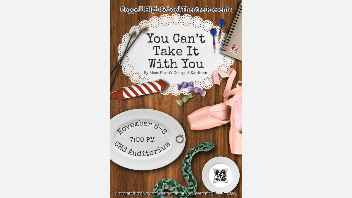 Get ready to laugh out loud as Coppell High School Theatre proudly presents the classic American comedy You Can’t Take It With You! This heartwarming and hilarious production follows the eccentric Sycamore family as their unconventional ways collide with the straight-laced Kirbys when love brings their two worlds together.
